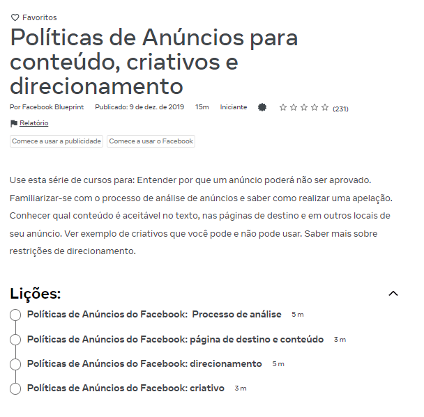 Lendo essa descrição você pode entender que esse curso ajuda a entender o processo de avaliação de anúncios, bem como bloqueios e apelações. E esse conteúdo está dividido em 4 lições, cada uma para cada assunto, com duração de 3 a 5 minutos cada.
