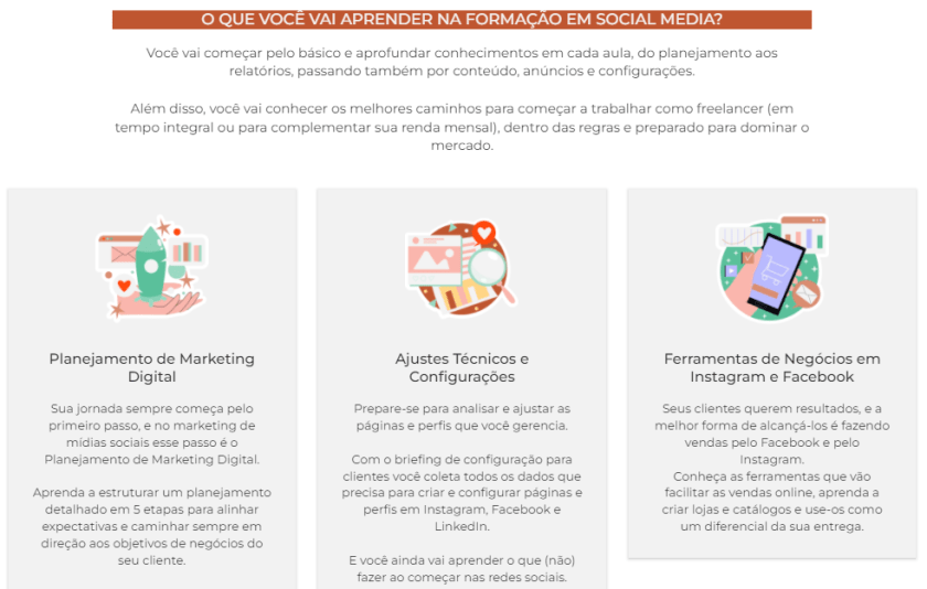 Na Formação em Social Media, por exemplo, o investimento é de R$ 766 e nesse valor está incluído: