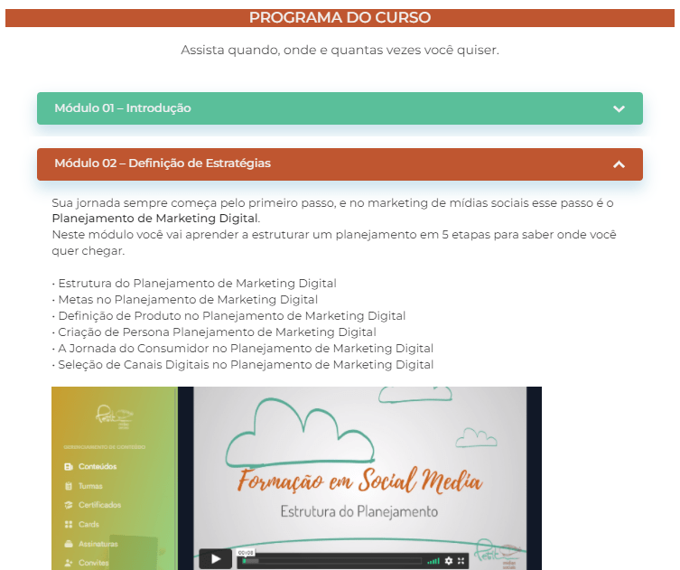 Depois disso, você encontra a lista dos 8 módulos que compõem este curso de mídias sociais.