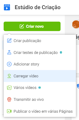 No Facebook, você vai começar abrindo o Estúdio de Criação e clicando em Criar novo > Carregar vídeo.