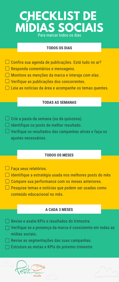 Para ajudar você a organizar seu trabalho, confira este checklist com algumas atividades que não podem faltar no seu dia, semana, mês e trimestre (use um checklist para cada cada cliente, se você atender mais que um, ok?).
